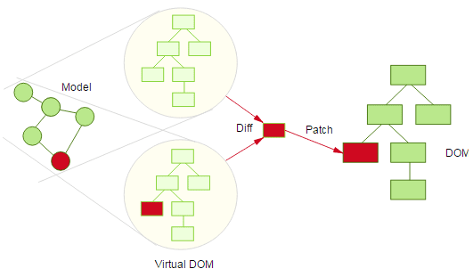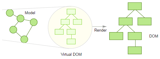 상태(state)나 속성(props)이 변경되면 새로운 Virtual DOM이 생성되고 이전 Virtual DOM과 새 Virtual DOM을 비교하여 변경된 부분만 확인 후 실제 DOM에 적용.( 전체를 다시 렌더링X)