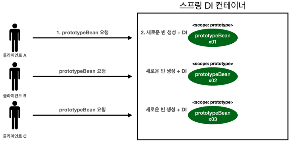 3. 생성한 프로토타입 빈 클라이언트에 반환, 관리x (@PreDestroy 같은 종료 메서드가 호출x )