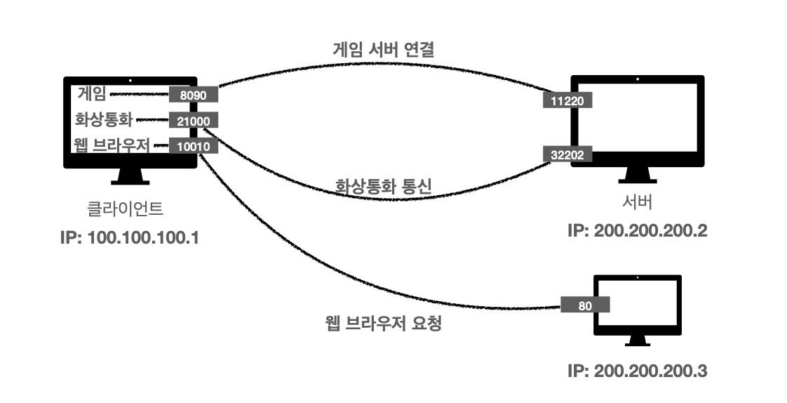 클라이언트 서버로 패킷 보낼때, "IP + PORT" 조합으로 보냄