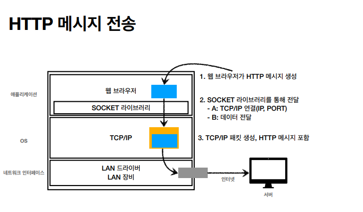 3. HTTP 메세지를 SOCKET 라이브러리를 통해 OS 계층 내 TCP/IP 계층에 전달을 한다.